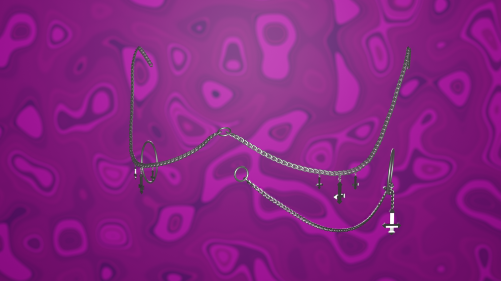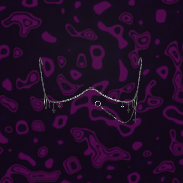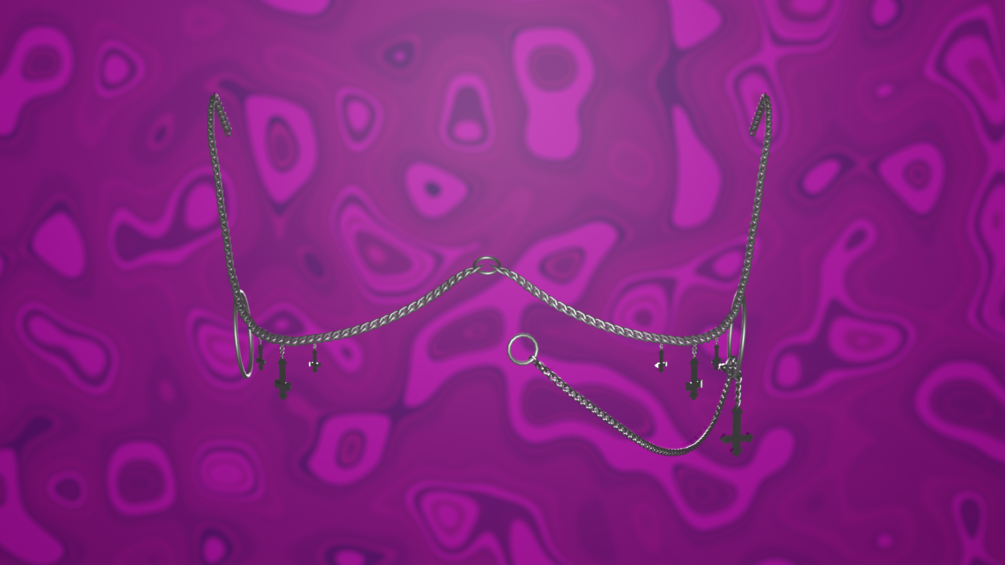 A facechain with a nose ring rings on ears that crosses hang from, there is also crosses hanging from the chain that moves with physbones, they are rigged and weightpainted to move nicely :D